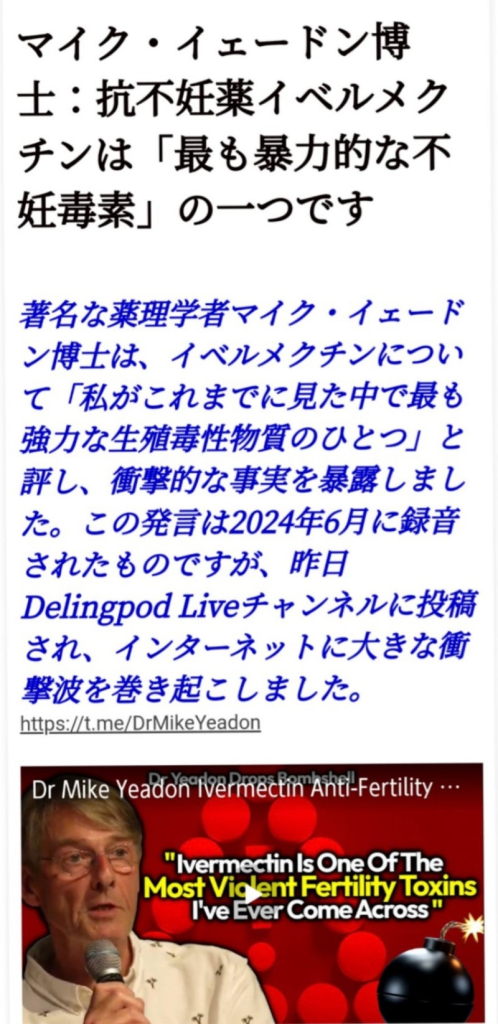 イードン博士はじめ、多くの方々の警告がでていますが、イベルメクチンで症状から回復した方が多くいるのも事実です。